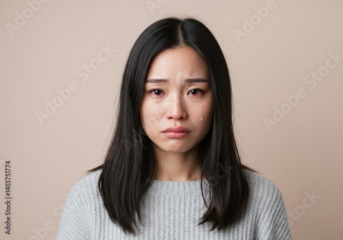 melancholic asian woman with teary eyes wearing light gray sweater on soft pastel background. generative ai