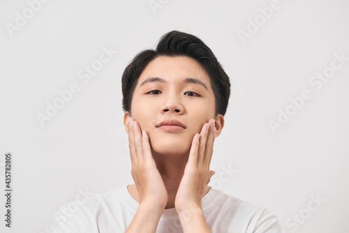Men Face Care. Man Touching Smooth Skin After Shaving