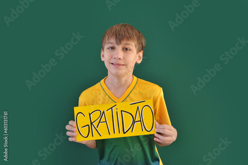 menino brasileiro segurando placa da gratidão