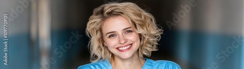 Mental Health and Wellness Concept, A smiling woman with curly hair wears a blue shirt, radiating joy in a softly lit corridor.