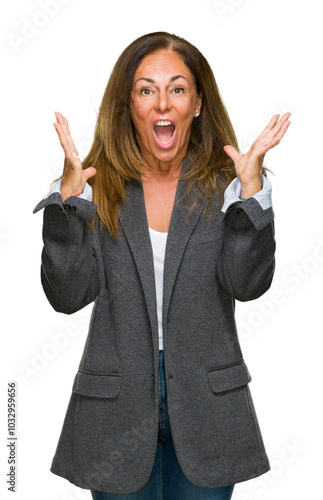 Middle age adult woman wearing oversize boyfriend jacket over isolated background celebrating crazy and amazed for success with arms raised and open eyes screaming excited. Winner concept