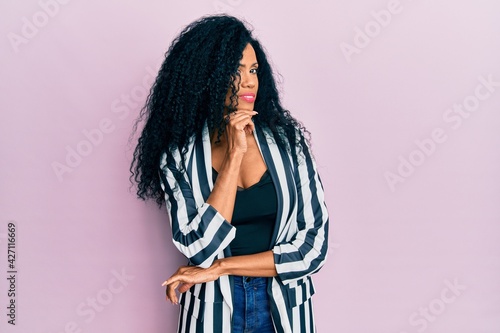Middle age african american woman wearing casual clothes looking confident at the camera with smile with crossed arms and hand raised on chin. thinking positive.