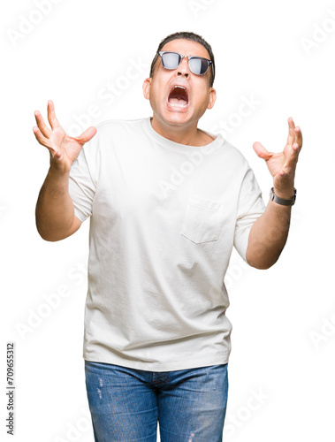 Middle age arab man wearig white t-shirt and sunglasses over isolated background celebrating crazy and amazed for success with arms raised and open eyes screaming excited. Winner concept