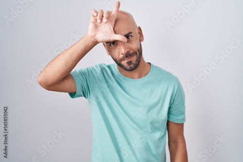 Middle age bald man standing over white background making fun of people with fingers on forehead doing loser gesture mocking and insulting.