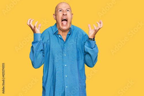 Middle age bald man wearing casual clothes crazy and mad shouting and yelling with aggressive expression and arms raised. frustration concept.