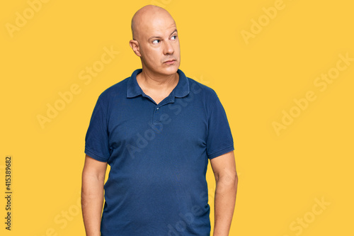 Middle age bald man wearing casual clothes smiling looking to the side and staring away thinking.