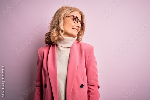 Middle age beautiful blonde business woman wearing elegant pink jacket and glasses looking away to side with smile on face, natural expression. Laughing confident.