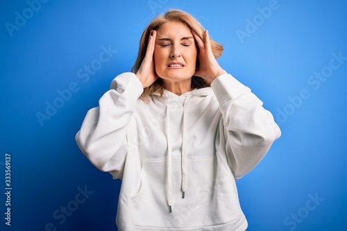 Middle age beautiful blonde sportswoman wearing sportswear over isolated blue background suffering from headache desperate and stressed because pain and migraine. Hands on head.