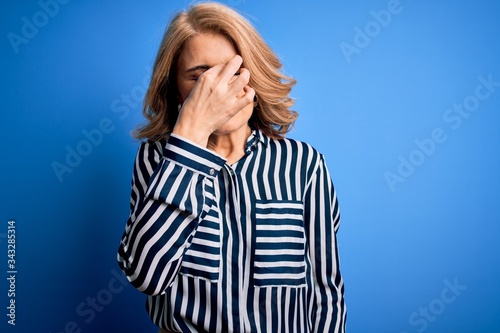 Middle age beautiful blonde woman wearing casual striped shirt standing over blue background tired rubbing nose and eyes feeling fatigue and headache. Stress and frustration concept.