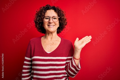Middle age beautiful curly hair woman wearing casual striped sweater over red background smiling cheerful presenting and pointing with palm of hand looking at the camera.