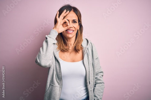Middle age beautiful sportswoman wearing casual sweatshirt over isolated pink background doing ok gesture with hand smiling, eye looking through fingers with happy face.