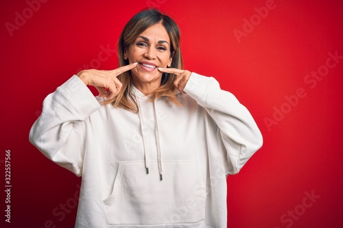 Middle age beautiful sportswoman wearing casual sweatshirt over isolated red background smiling cheerful showing and pointing with fingers teeth and mouth. Dental health concept.