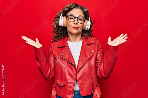 Middle age beautiful woman listening to music using headphones over red background clueless and confused with open arms, no idea and doubtful face.