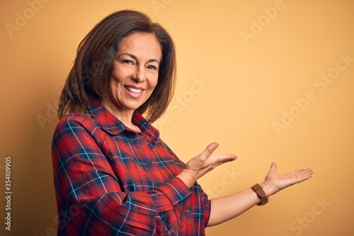 Middle age beautiful woman wearing casual shirt standing over isolated yellow background Inviting to enter smiling natural with open hand