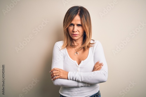 Middle age beautiful woman wearing casual t-shirt standing over isolated white background skeptic and nervous, disapproving expression on face with crossed arms. Negative person.