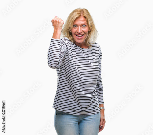 Middle age blonde woman over isolated background angry and mad raising fist frustrated and furious while shouting with anger. Rage and aggressive concept.