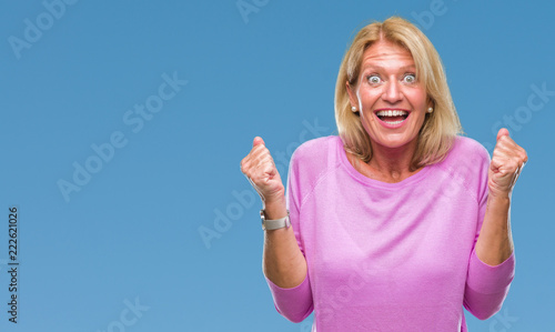 Middle age blonde woman over isolated background celebrating surprised and amazed for success with arms raised and open eyes. Winner concept.
