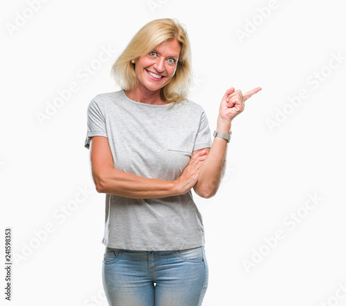 Middle age blonde woman over isolated background with a big smile on face, pointing with hand and finger to the side looking at the camera.