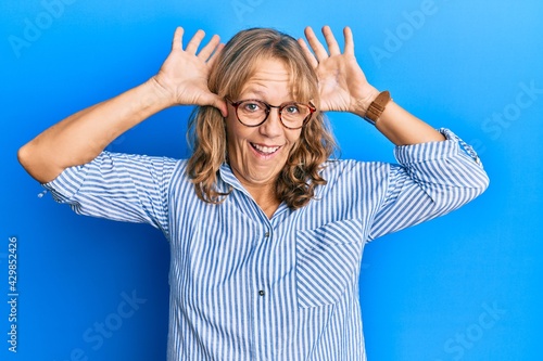 Middle age blonde woman wearing casual clothes and glasses smiling cheerful playing peek a boo with hands showing face. surprised and exited