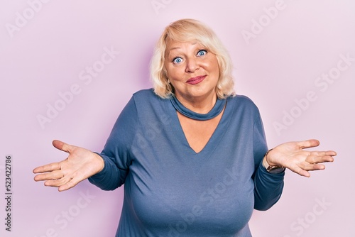 Middle age blonde woman wearing casual clothes clueless and confused expression with arms and hands raised. doubt concept.