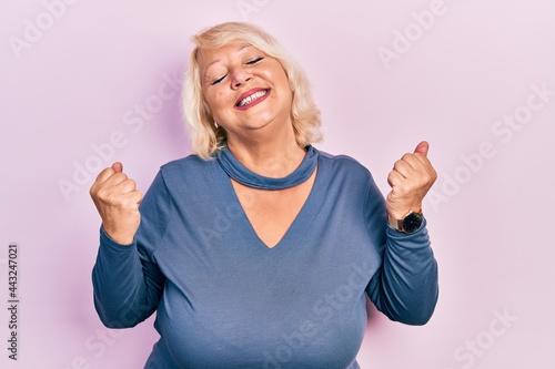 Middle age blonde woman wearing casual clothes very happy and excited doing winner gesture with arms raised, smiling and screaming for success. celebration concept.