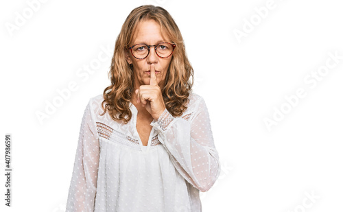 Middle age blonde woman wearing casual white shirt and glasses asking to be quiet with finger on lips. silence and secret concept.