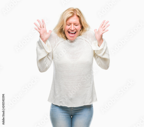 Middle age blonde woman wearing winter sweater isolated background celebrating mad and crazy for success with arms raised and closed eyes screaming excited. Winner concept