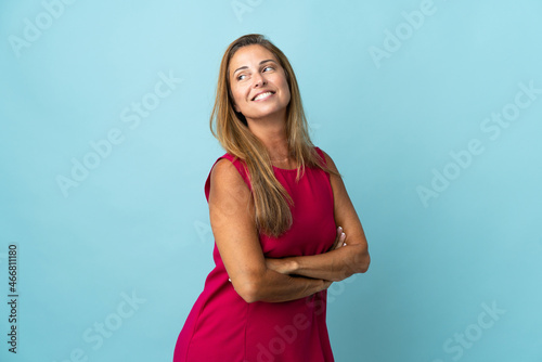 Middle age brazilian woman isolated on blue background with arms crossed and happy