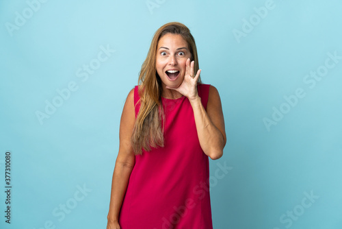 Middle age brazilian woman isolated on blue background with surprise and shocked facial expression