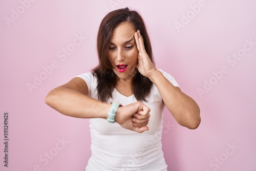 Middle age brunette woman standing over pink background looking at the watch time worried, afraid of getting late