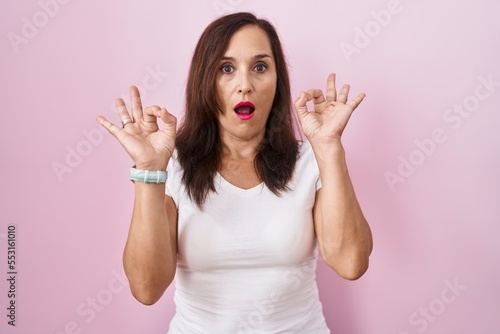 Middle age brunette woman standing over pink background looking surprised and shocked doing ok approval symbol with fingers. crazy expression