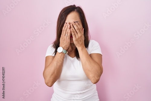 Middle age brunette woman standing over pink background rubbing eyes for fatigue and headache, sleepy and tired expression. vision problem