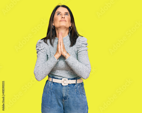 Middle age brunette woman wearing casual clothes begging and praying with hands together with hope expression on face very emotional and worried. begging.