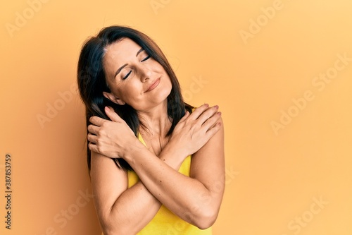 Middle age brunette woman wearing casual clothes over yellow background hugging oneself happy and positive, smiling confident. self love and self care
