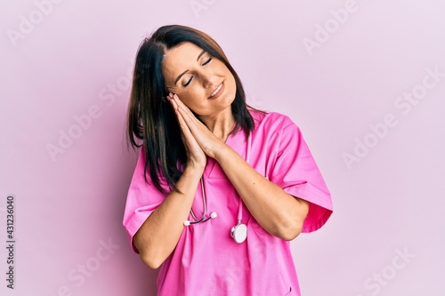 Middle age brunette woman wearing doctor uniform and stethoscope sleeping tired dreaming and posing with hands together while smiling with closed eyes.