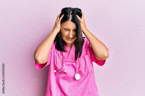 Middle age brunette woman wearing doctor uniform and stethoscope suffering from headache desperate and stressed because pain and migraine. hands on head.