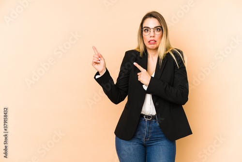 Middle age business woman isolated on beige background shocked pointing with index fingers to a copy space.