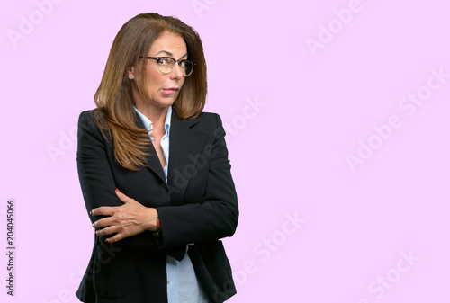 Middle age business woman nervous and scared biting lips looking camera with impatient expression, pensive