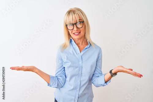 Middle age businesswoman wearing elegant shirt and glasses over isolated white background clueless and confused with open arms, no idea concept.
