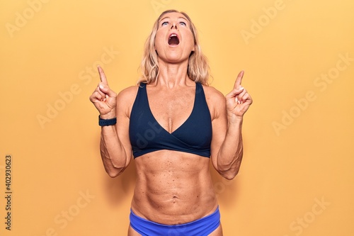 Middle age caucasian blonde woman wearing bikini amazed and surprised looking up and pointing with fingers and raised arms.