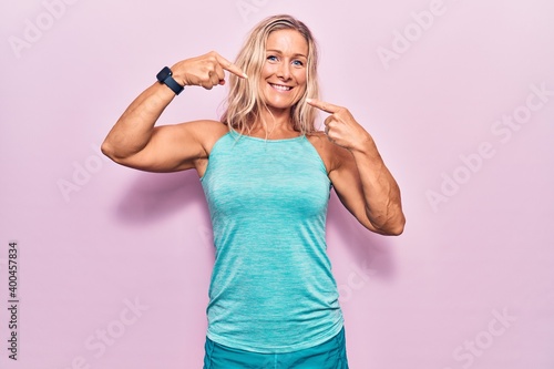 Middle age caucasian blonde woman wearing sports clothes over pink background smiling cheerful showing and pointing with fingers teeth and mouth. dental health concept.
