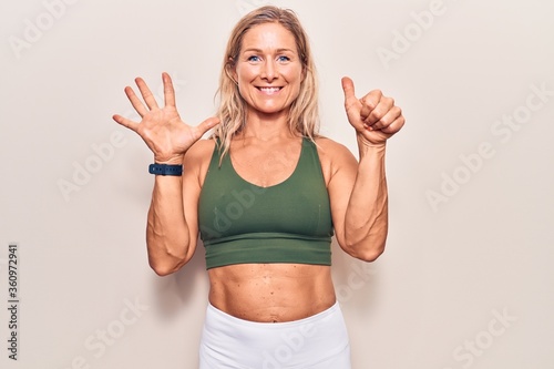 Middle age caucasian blonde woman wearing sportswear showing and pointing up with fingers number six while smiling confident and happy.