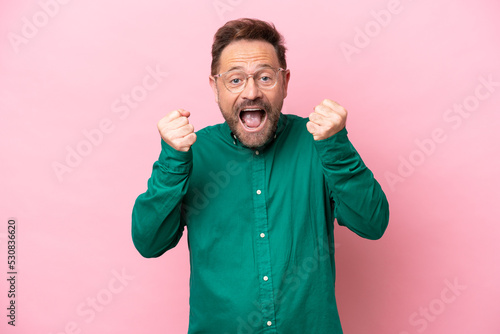 Middle age caucasian man isolated on pink background celebrating a victory in winner position
