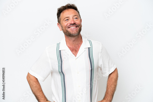 Middle age caucasian man isolated on white background posing with arms at hip and smiling