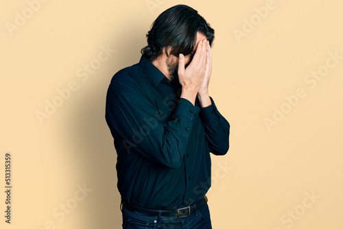 Middle age caucasian man wearing casual clothes and glasses with sad expression covering face with hands while crying. depression concept.