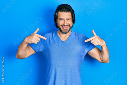 Middle age caucasian man wearing casual clothes looking confident with smile on face, pointing oneself with fingers proud and happy.
