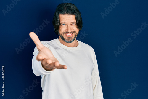 Middle age caucasian man wearing casual clothes smiling friendly offering handshake as greeting and welcoming. successful business.