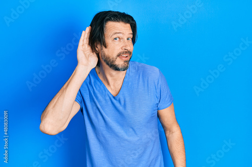 Middle age caucasian man wearing casual clothes smiling with hand over ear listening an hearing to rumor or gossip. deafness concept.