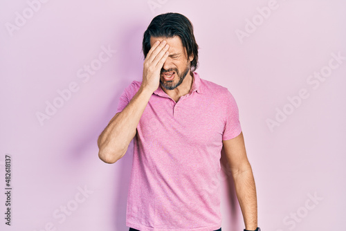 Middle age caucasian man wearing casual white t shirt yawning tired covering half face, eye and mouth with hand. face hurts in pain.