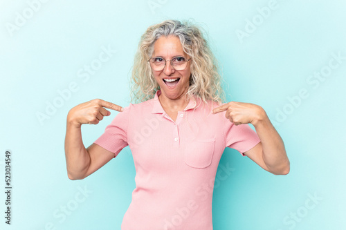 Middle age caucasian woman isolated on blue background surprised pointing with finger, smiling broadly.